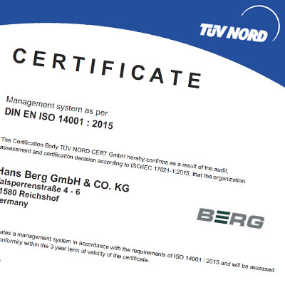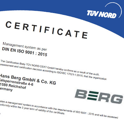 At Berg, quality and environmental management are fully integrated in all processes and procedures – and firmly embedded as core components of the company policy. Both internally and externally, our efforts are documented by the demanding and strict certification requirements of DIN EN ISO 9001:2008 and DIN EN ISO 14001:2004. They signal the company's ambitious aspirations regarding responsible treatment of people and environment. In addition, Berg's management system also meets the technical specifications of the international automotive industry according to ISO/TS 16949:2009.
